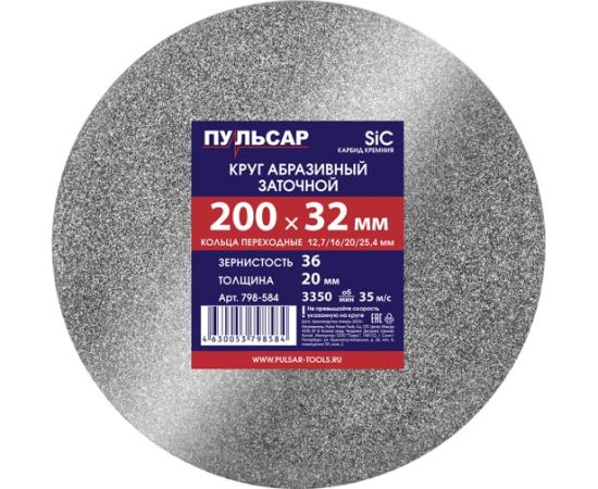 Диск абразивный для точила Пульсар 200 х 32 х 20 мм F 36 (798-584) серый (SiC) + кольца переходные