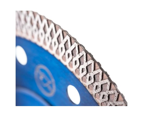 Особенности: Х-образная режущая кромка позволяет резать без применения воды. Фланец на корпусе диска, для дополнительной жесткости корпуса, и ультратонкая режущая кромка обеспечивают чистый рез без сколов. Высота алмазного слоя - 10 мм.