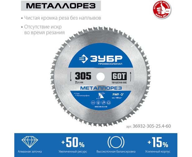 Диск пильный по металлу Зубр 36932-305-25.4-60 d-305мм dпосад-254мм торцовочные пилы