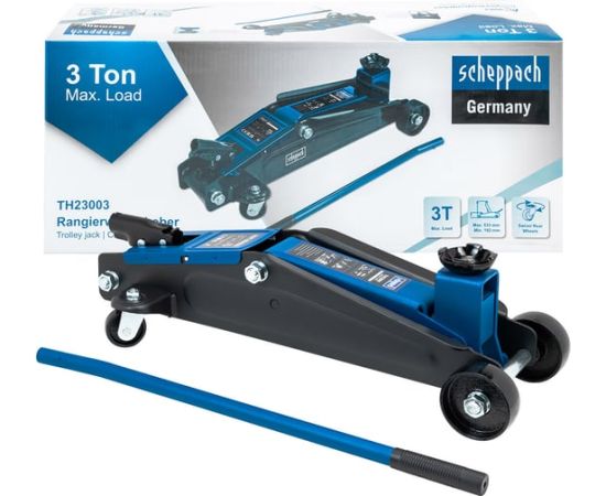 Домкрат подкатной гидравлический грузоподьемностью до 3 тонн от бренда Scheppach идеально подходит для ежедневного использования в автомастерской, на шиномонтаже или в гараже.