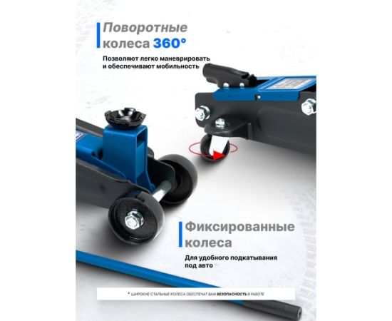 Мобильность и надежность: домкрат оснащен 2 фиксированными и 2 поворотными колесами, поэтому его можно легко перемещать. Благодаря предохранительному клапану домкрат соответствует стандарту безопасности.