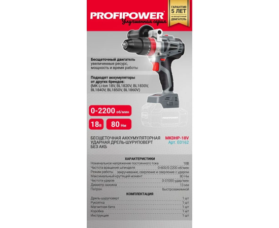 Аккумуляторная дрель бесщеточная ударная ProfiPower MKDHP-18V (без акб,18В,80Нм, 2 скорости,магнитная бита,рукоятка,в коробке)