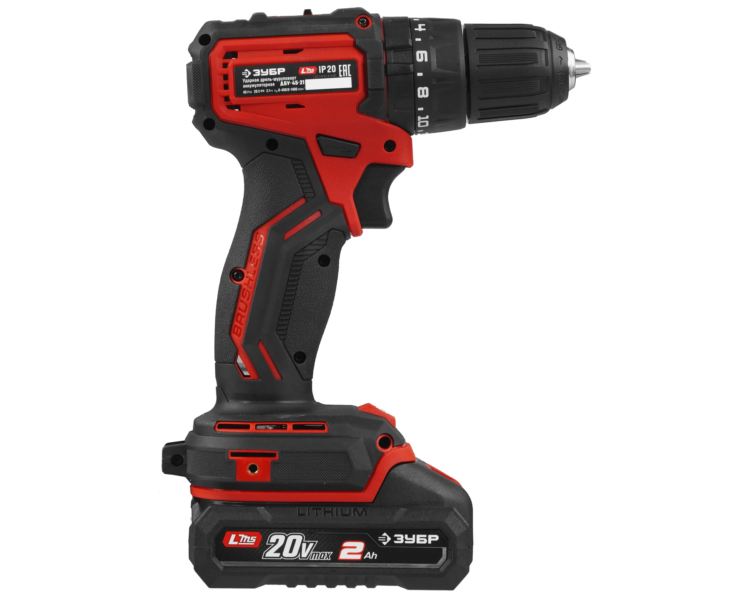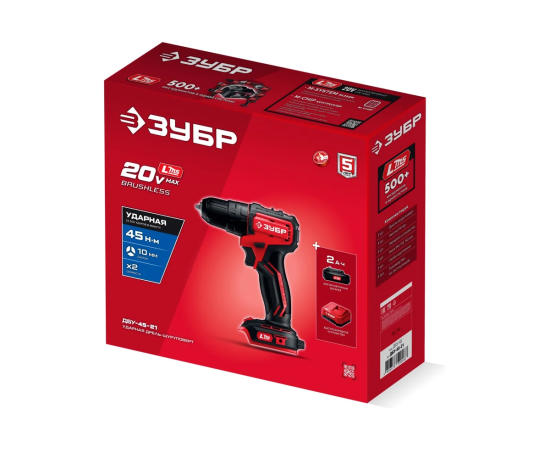ЗУБР 20 В, 45 Н·м, 1 АКБ LMS (2 А·ч), бесщеточная ударная дрель-шуруповерт ДБУ-45-21 - инструмент из единой аккумуляторной системы LMS для 500+ инструментов.