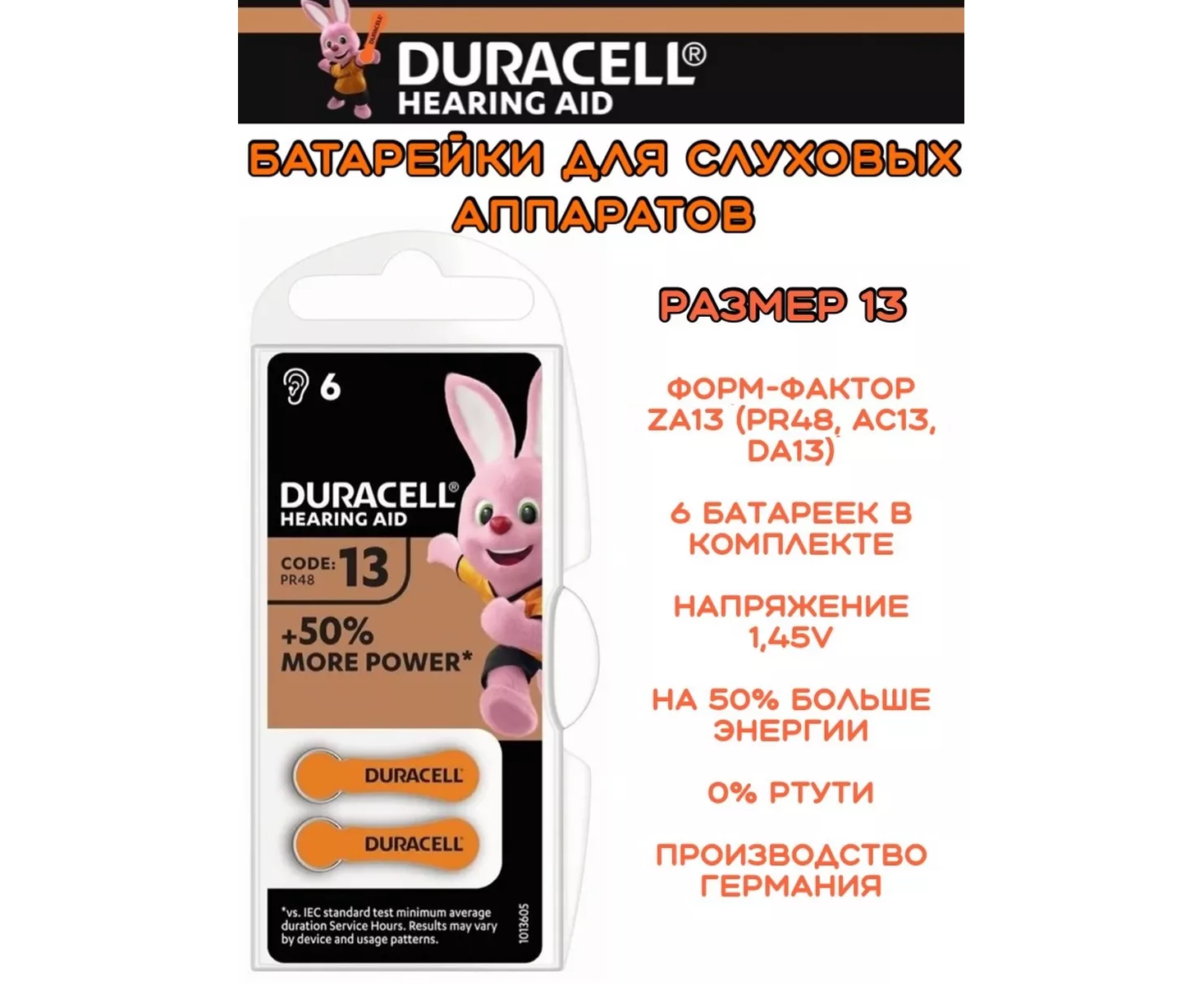 Батарейка Duracell ZA13 / PR48 / AC13 / DA13 12 шт., для слуховых аппаратов Zinc Air 1.45V DE Не упустите ни одного звука благодаря долговечным батарейкам Дюрасел для слуховых аппаратов и речевых процессоров в размере 13 с ярлычком EasyTab. Удлиненный защитный ярлычок EasyTab облегчает процесс держания и замены батареек в ушных аппаратах, а легкая упаковка открывается без труда. Батарейки для слуховых аппаратов с ярлычком EasyTab различаются по цвету, поэтому выбрать батарейку подходящего размера очень просто. . Технология: воздушно-цинковая. Если начать эксплуатацию батарейки дюраселл сразу после снятия защитной пленки, то активация произойдет только в поверхностном слое вещества, что негативно скажется на сроке ее службы. Взаимозаменяемость батарейки для ушных аппаратов типа 13: A13, PR48, AC13, DA13, ZA13, B0134, B26PA, ME8ZA, P13 (4606), W13ZA, 13A, AC13E/EZ, PR13H.