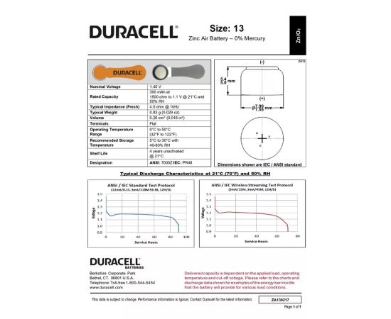 Duracell Activair 13 - специально разработаны для надежной работы в чувствительных слуховых аппаратах. Обладают большой емкостью, не содержат токсичных веществ, имеют длительный срок хранения, поскольку конструкция элемента предусматривает специальную наклейку-ярлычок, исключающую доступ воздуха до момента эксплуатации. Удлиненный защитный ярлычок EasyTab облегчает процесс держания и замены батареек, а легкая упаковка открывается без труда. Батарейки дюрасел для слуховых аппаратов с ярлычком EasyTab различаются по цвету, поэтому выбрать батарейку подходящего размера очень просто. Кроме того, батарейки дюрасел Hearing Aid для слуховых аппаратов сохраняют заряд до 4 лет при хранении в нормальных условиях. Для достижения оптимального результата активированную батарейку в аппарат вставляют не сразу. Нужно дать время активному веществу насытиться кислородом (примерно 5 минут). Если начать эксплуатацию батарейки сразу после снятия защитной пленки, то активация произойдет только в поверхностном слое вещества, что негативно скажется на сроке ее службы.