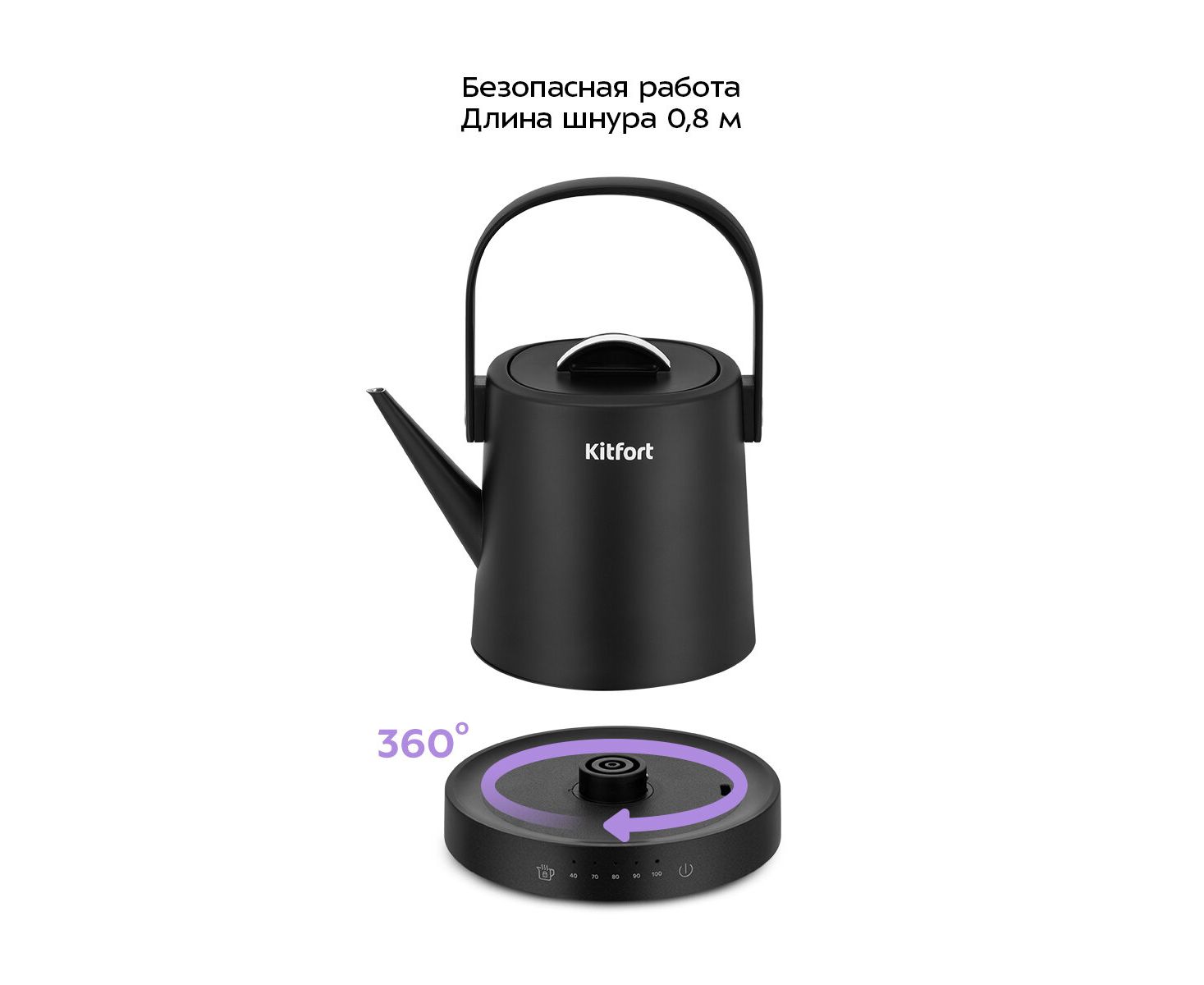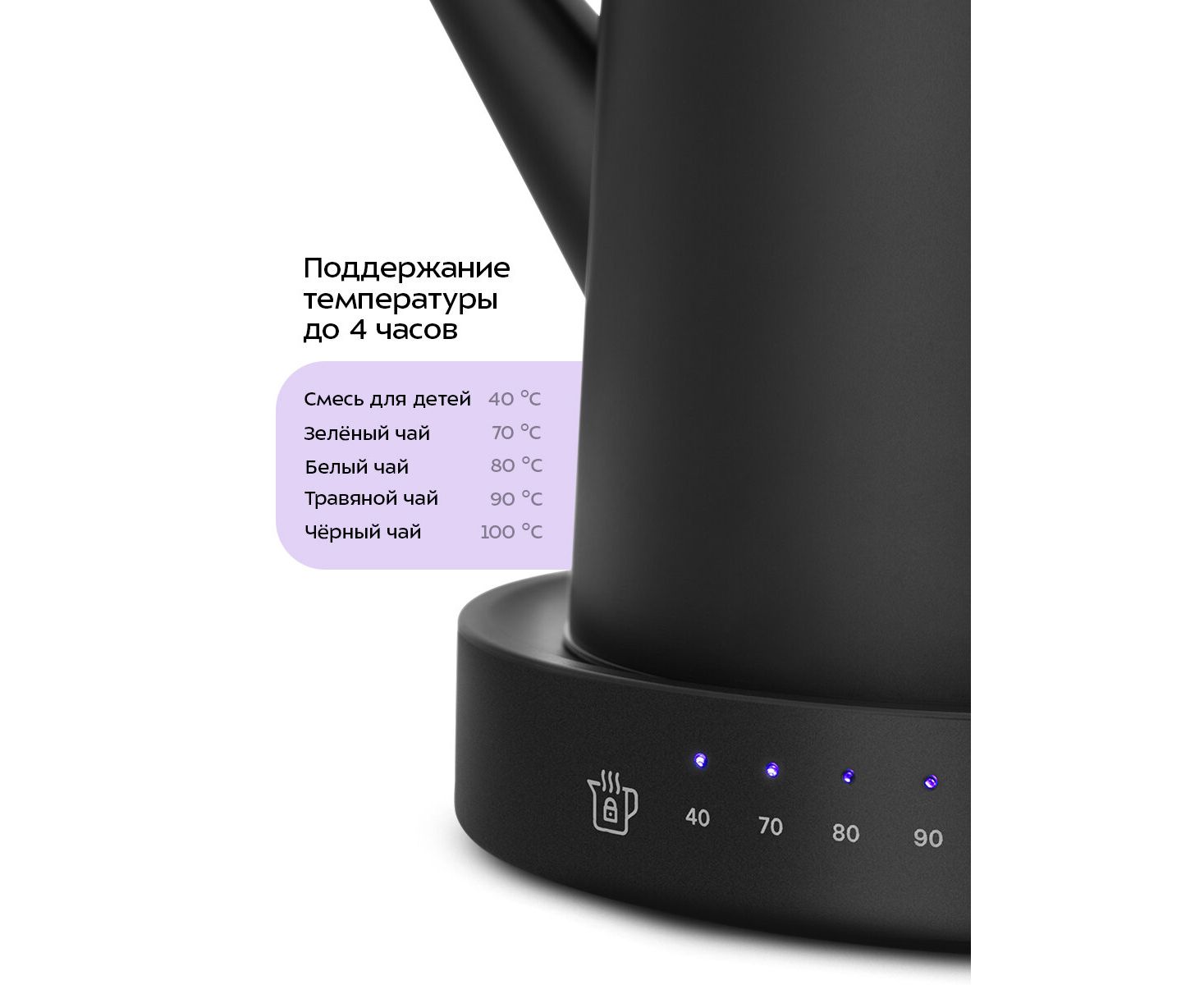 Электрический чайник может не только вскипятить воду, но и нагреть ее до температур: 40, 70, 80 и 90 °С‚ что очень удобно при заваривании различных сортов чая, детского питания и т.д. Чайник также оснащён функцией поддержания температуры.
