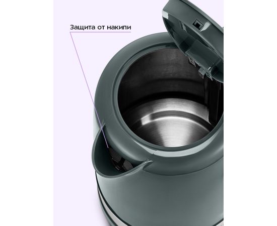 Чайник автоматически отключается при закипании, имеет защиту от перегрева и от включения без воды. В носике чайника расположен фильтр, который задерживает частички накипи и предотвращает их попадание в чашку.