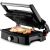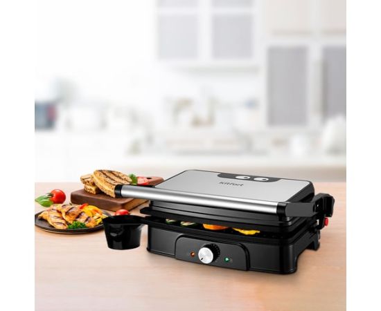 Верхняя нагреваемая панель может опускаться не до конца, что полезно при готовке продуктов, которые могут потерять форму из-за давления крышки. Также панель откидывается на 180°, и гриль превращается в жаровню, а продукты выкладываются сразу на 2 панели.