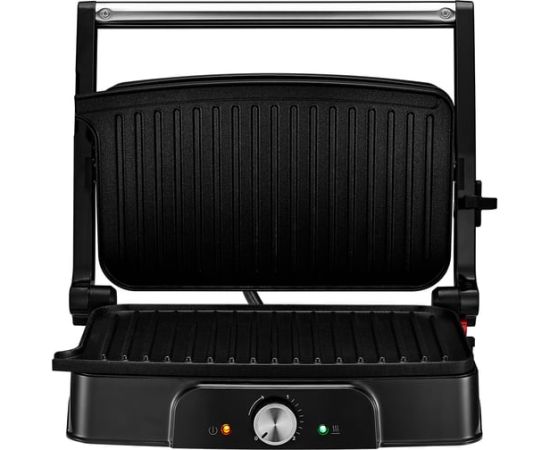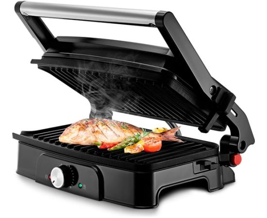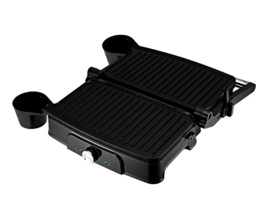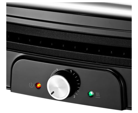 Электрогриль оснащён термостатом для поддержания постоянной температуры панелей и индикаторами, показывающими наличие питания, а также включение и отключение нагрева.