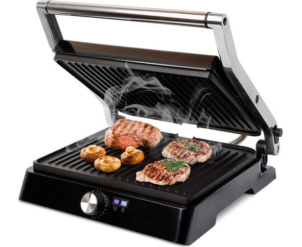 Электрогриль оснащён термостатом для поддержания постоянной температуры панелей и индикаторами, показывающими наличие питания, а также включение и отключение нагрева.