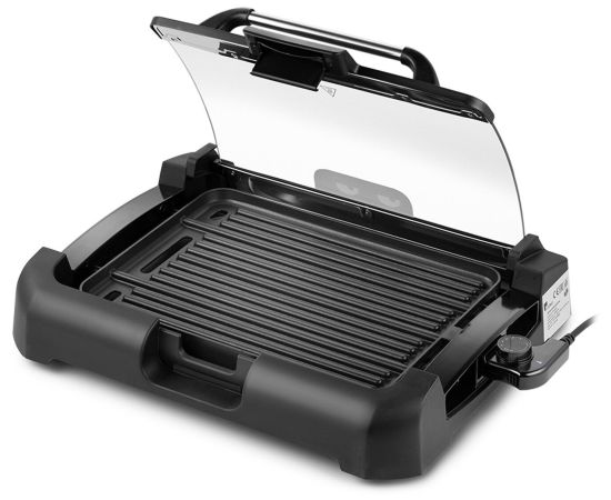 Накрывается гриль крышкой из закалённого стекла, через неё можно наблюдать за процессом приготовления. Удобная ручка не нагревается. Крышка фиксируется в верхнем положении, поэтому вам не придётся её снимать и искать дополнительное место на столе.