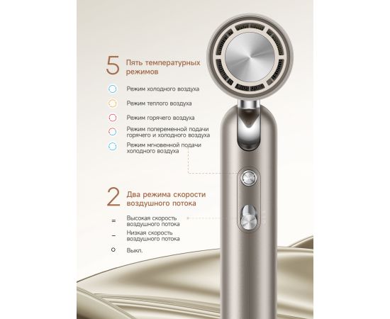 Особенности Элегантный дизайн, Бережная сушка при 57℃, Ионизация, Пять температурных режимов