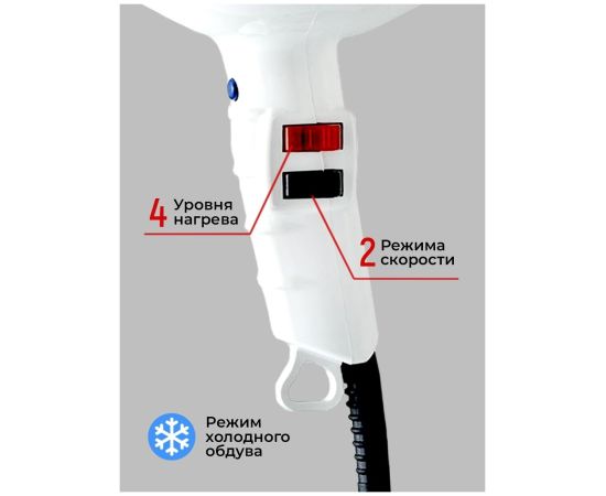 Стильный фен для укладки отличается от других не только основными характеристиками, но и продуманным дизайном. Обдув воздуха равномерно распределяется по всей длине. Ручка комфортно ложится в руку. Положение кнопок позволяет удобно переключаться между 4 температурными режимами и двумя скоростями.