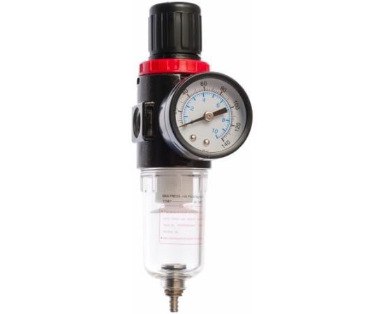 Фильтр-регулятор с манометром FR-101 FUBAG 190101 применяется для очистки сжатого воздуха. Также он регулирует давление и поддерживает его на необходимом уровне. Объединение фильтра и регулятора в одном позволяет уменьшить габариты по сравнению с двумя разными элементами. На приборе располагается манометр, предназначенный для измерения давления. Фильтр имеет внутреннюю резьбу 1/4, при помощи которой крепятся соединительные элементы пневматической магистрали.