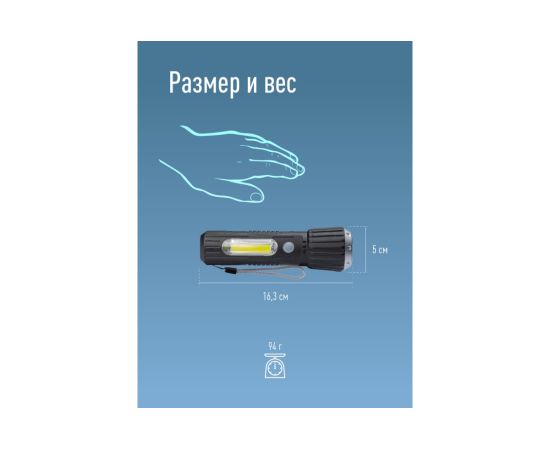 Технические характеристики КОСМОС KOS114Lit 1Вт LED+2Вт COB, коллиматорная линза, Li-ion 18650 1000mAh, ABS-пластик, USB шнур