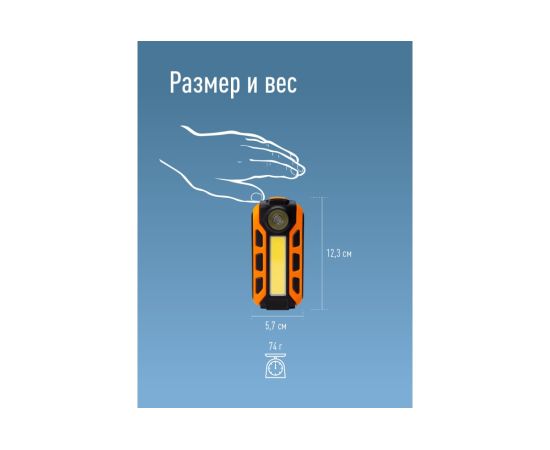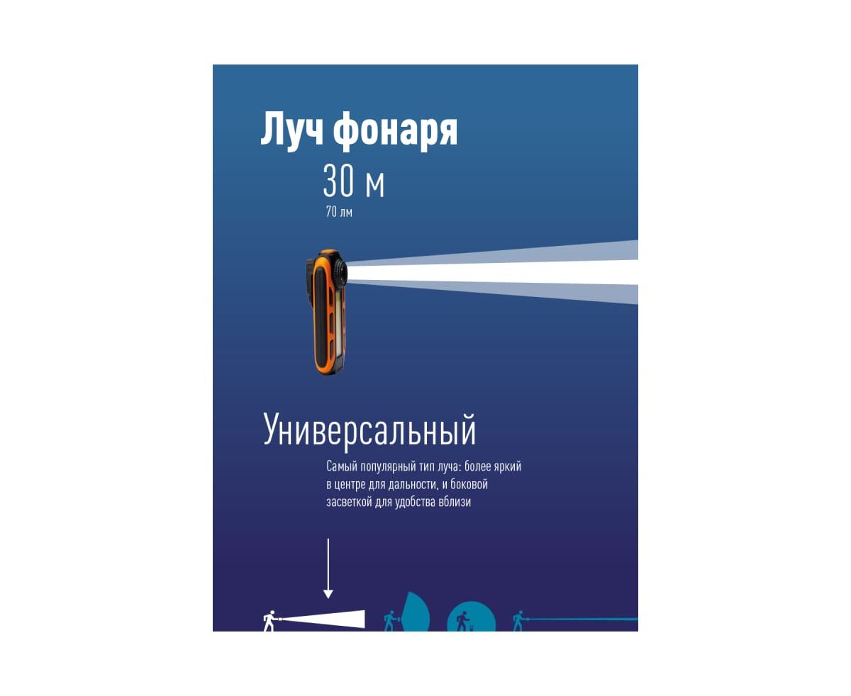 Источник света: 5 Вт COB LED (широкий свет); 1 Вт LED (луч), с коллиматорной линзой - позволяет создать поток света нужной направленности без снижения интенсивности. Световой поток: 160 лм. (широкий свет)/70 лм. (луч); Дистанция освещения: 21 м2 (широкий свет)/30 м (луч).