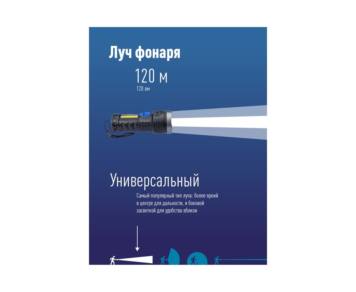 Ручной аккумуляторный фонарь КОСМОС 3Вт LED+3Вт COB, Li-ion 18650 1200mAh, ABS-пластик, индикатор, USB-шнур KOS115Lit с мощностью и свойствами прожектора в легком ручном корпусе. Совмещает луч фонаря (направленный свет) и широкий свет (освещает широкое пространство с одной стороны). Источник питания: Li-ion аккумулятор 18650 3,7В 1200 мА/ч (встроенный). Источник света: мощный луч 3Вт LED; мощный боковой светильник 3Вт COB LED.