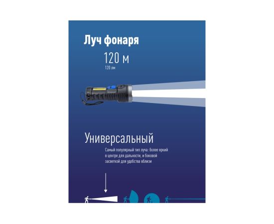 6.Дистанция освещения: 120 м. (луч)/17м2 (широкий свет, боковой светильник).