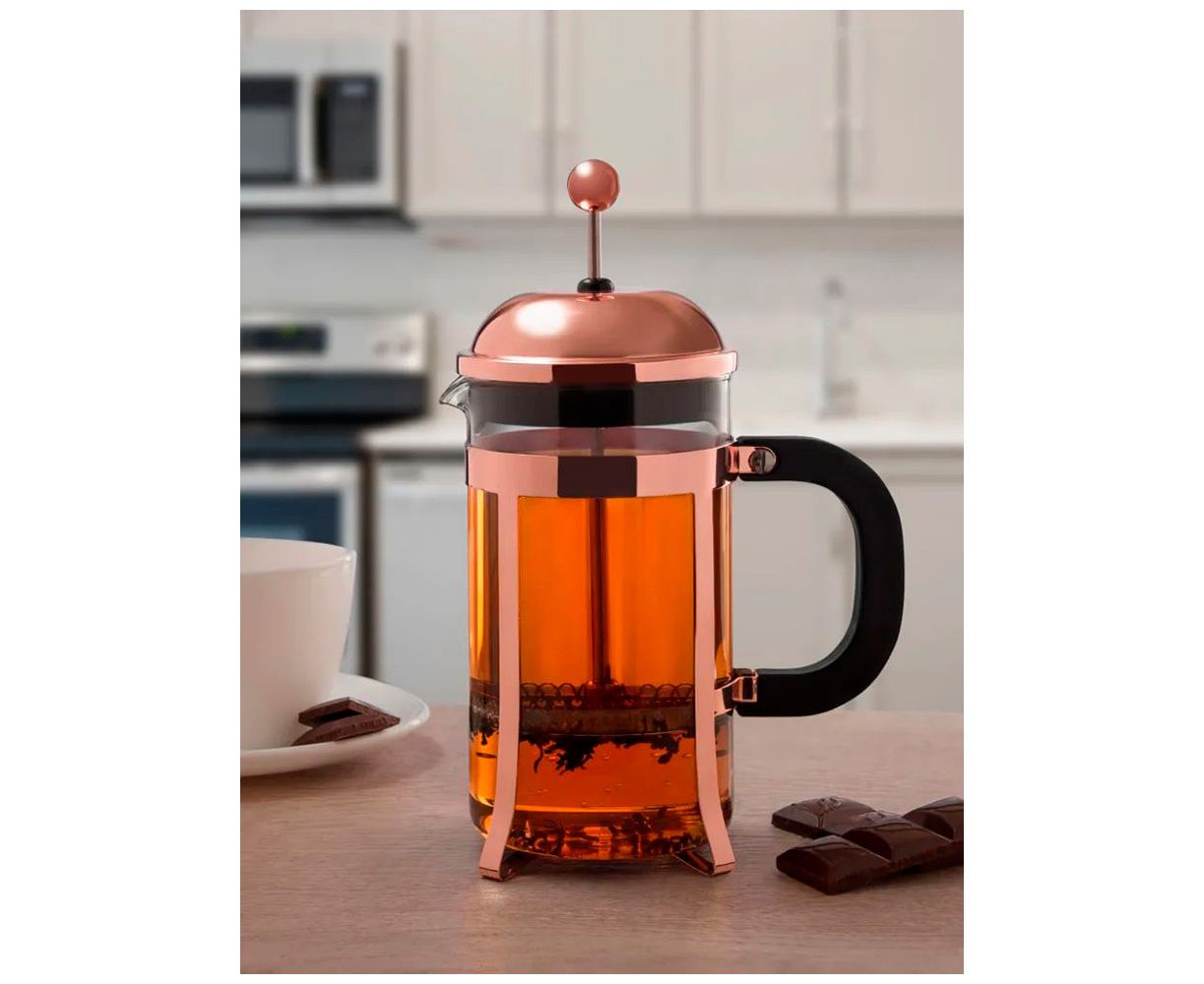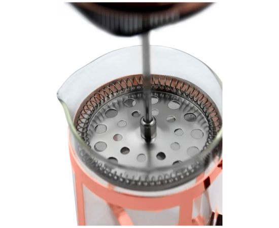 Френч-пресс изготовлен из стекла, пластика и высококачественной нержавеющей стали. Предназначен для приготовления кофе или чая, методом настаивания и отжима. Колба из боросиликатного стекла жароустойчива, выдерживает температуру 100°С, не впитывает запахи. Пресс-фильтр плотно прижимает частички кофе или заварки ко дну френч-пресса, а уплотнительное кольцо не дает им попасть в напиток. Прозрачный корпус позволяет наблюдать за процессом насыщения напитка. У френч-пресса удобная ручка, плотная закрывающаяся крышка.