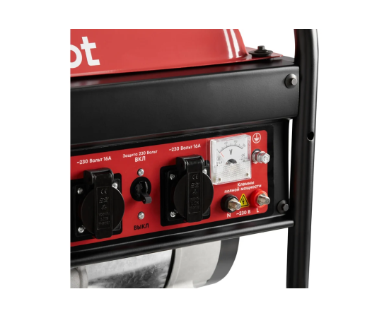Две розетки 16А облегчают использование с несколькими потребителями. Клеммы полной мощности 230 В позволяют задействовать всю мощность генератора в любых условиях, даже без использования штепсельной вилки: достаточно оголить концы проводов, накрутить их на клеммы и зажать защитными колпачками.
