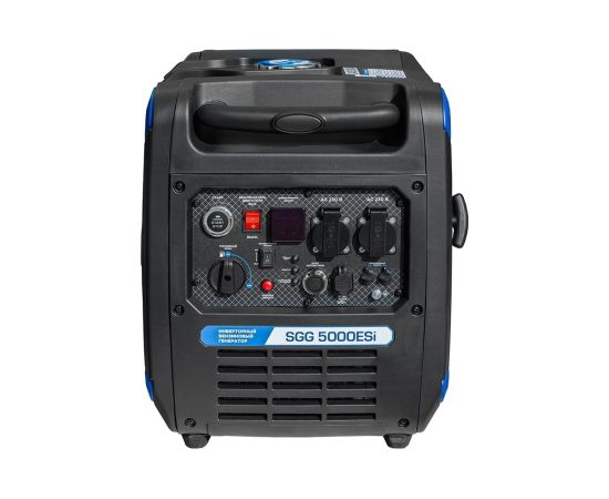 Бензогенератор инверторный SGG 5000ESi в шумопоглощающем кожухе, с электростартом и разъемом для подключения блока автоматики, вырабатывает электричество высокой точности частоты и напряжения.