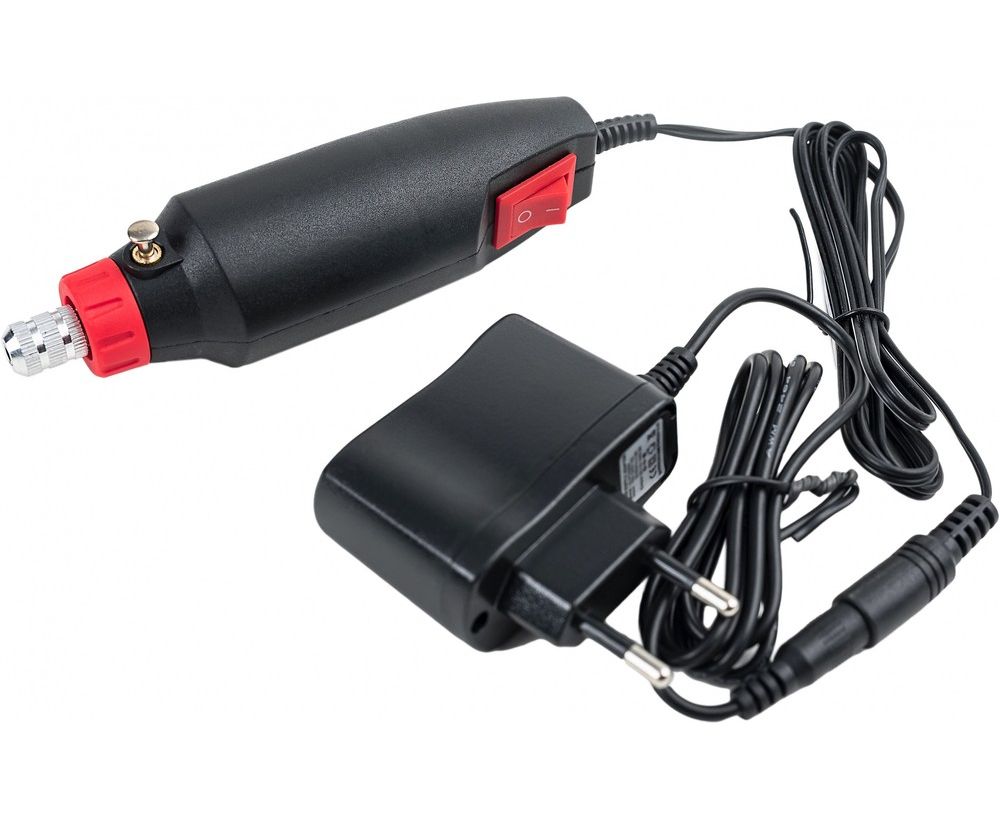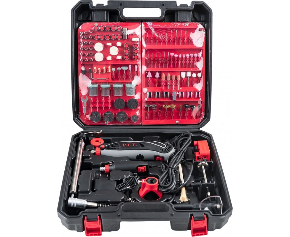 Комплектация -Гравер 150 Вт-Бормашина 12 вольт-Адаптер 12 вольт-Комплект из 350 принадлежностей-Кисть для удаления стружки-Цанги-Подсветка на диодах-Телескопический штатив-Гибкий вал-Пластиковый кейс