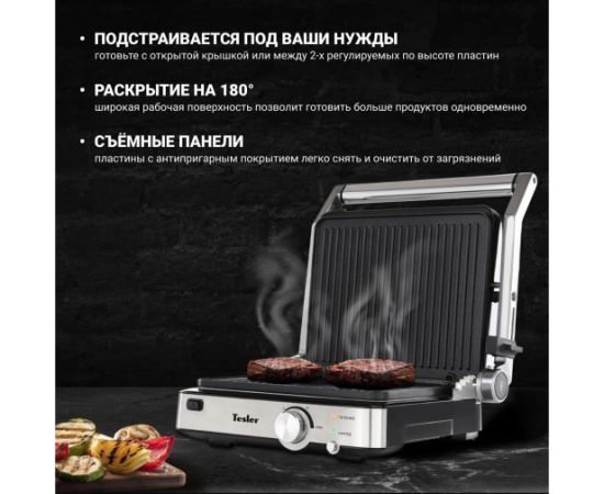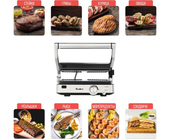 Электрогриль TESLER EG-205 00000096163 подходит для приготовления мяса, рыбы, морепродуктов, овощей и сэндвичей.