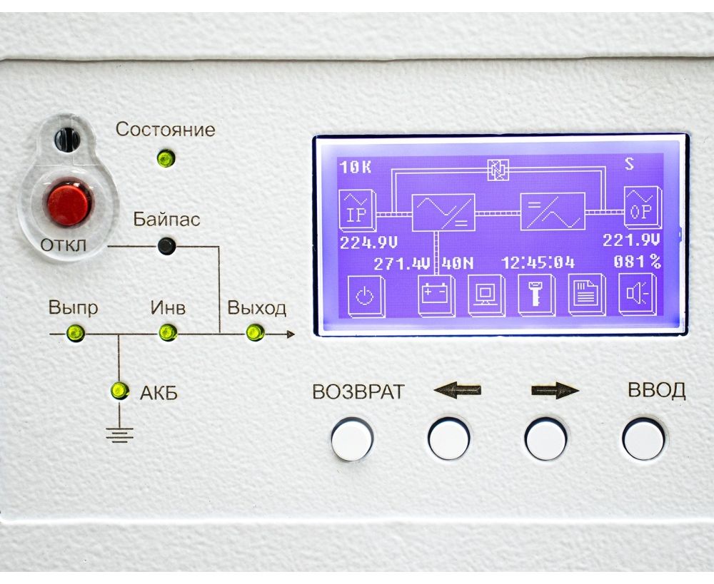 индикатор выпрямителя (REC), индикатор аккумуляторов (BAT), индикатор питания в обход ИБП (BYP), индикатор инвертора (INV), индикатор нагрузки (OUTPUT), индикатор состояния (STATUS)