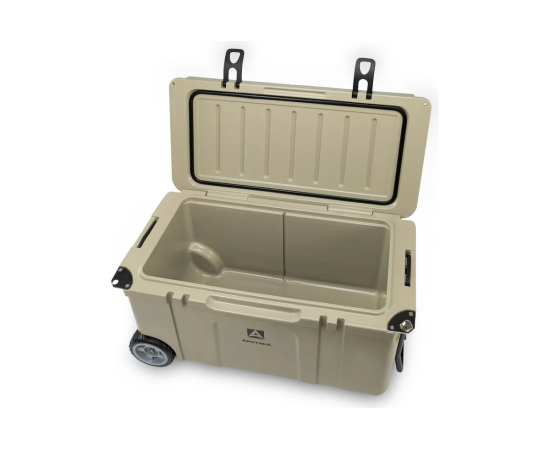 Термоконтейнер премиум-класса «Оймякон» создан для экстремальных условий. Усиленный корпус выдерживает нагрузку до 200 кг за счет толщины внутренних и внешних стенок (3 мм), не боится перепадов температуры и тряски на бездорожье. По сравнению с классическими термоконтейнерами данная модель удерживает холод (время до полного таяния льда) в 2 раза дольше при том же объеме. Благодаря высокой плотности и толщине термоизолирующего слоя контейнер подходит для многодневных экспедиций и долгих переездов, доставки замороженных и охлажденных продуктов, а также сохранения свежести улова и дичи вдали от дома. Модель продумана до мелочей: на крышке есть линейка для замера улова и подстаканники, силиконовая прокладка в крышке делает контейнер герметичным и «запирает» запахи, которые могут привлечь диких животных. Транспортировка упрощается за счет колес повышенной проходимости и удобной металлической ручки.