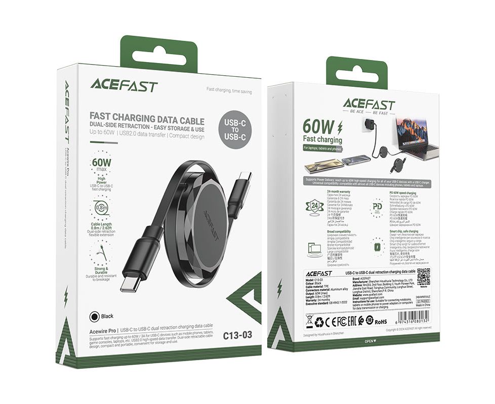 ACEFAST C13-03 60 Вт USB-C — USB-C выдвижной кабель для передачи данных для зарядки.