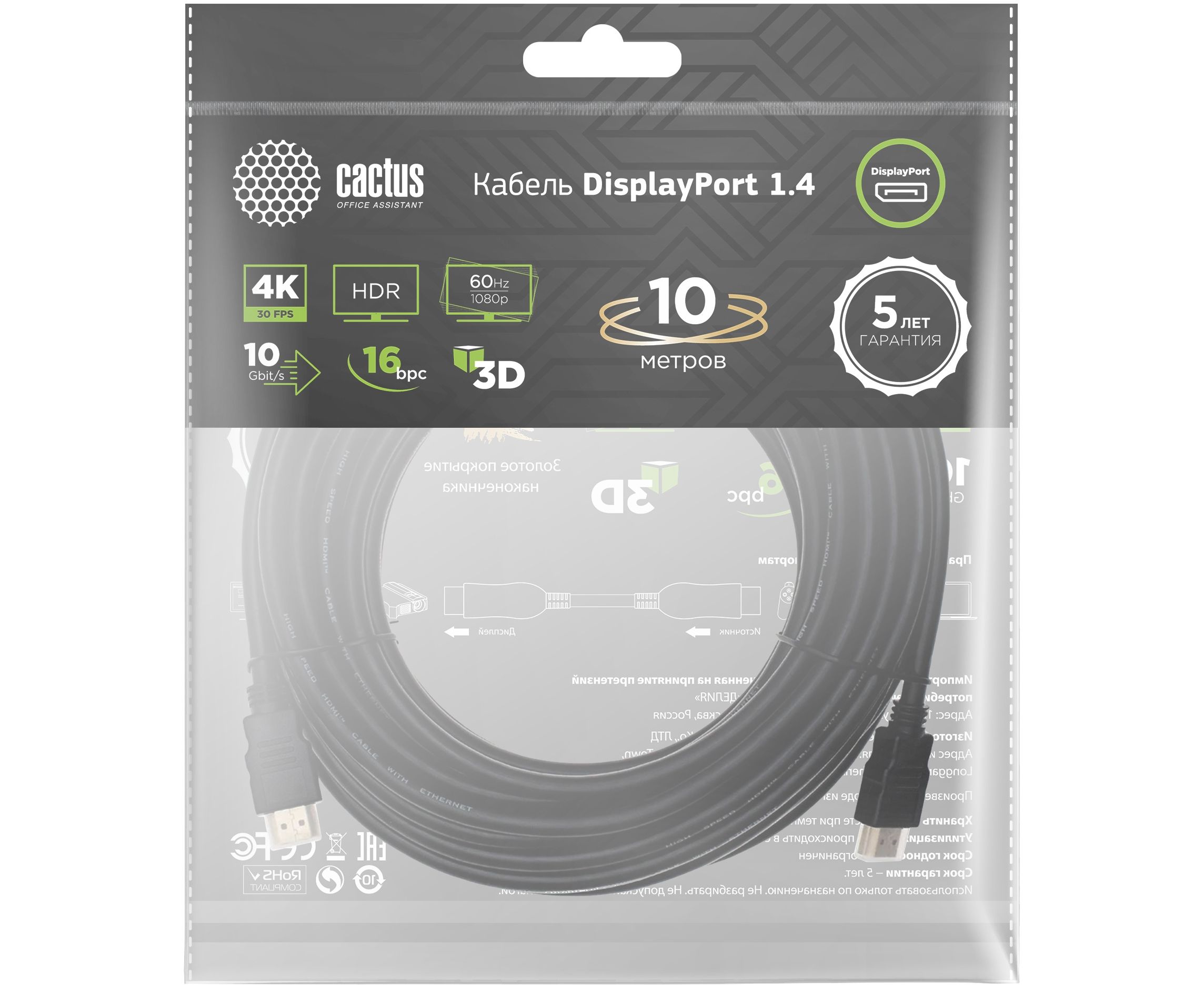 Кабель аудио-видео Cactus CS-DP-DP-1.4-10 DisplayPort(m)/DisplayPort(m) 10м позолоч.конт. черный