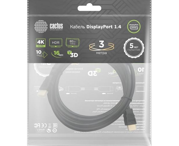 Кабель аудио-видео Cactus CS-DP-DP-1.4-3 DisplayPort(m)/DisplayPort(m) 3м позолоч.конт. черный