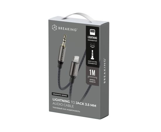 Кабель AUX Breaking Graphite, Lightning - AUX, соединяющий разъем Lightning с аудиовыходом формата AUX, предназначен для подключения совместимых мобильных устройств (например, iPhone) к автомобильной акустике, домашним стереосистемам или другим устройствам с входом AUX.