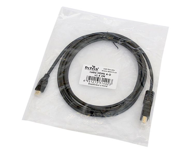 Кабель HDMI A-D v1.4 2M для подключения мультимедийных устройств. Оптимальная передача цифровых сигналов (аудио и видео в одном кабеле). Поддержка 3D, HDMI Ethernet. Позолоченные разъемы.