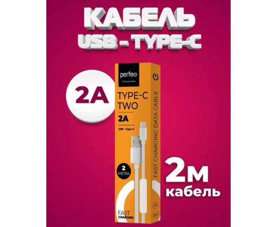 Кабель PERFEO U4708 USB2.0 A вилка - USB Type-C вилка, белый, длина 2м, бокс