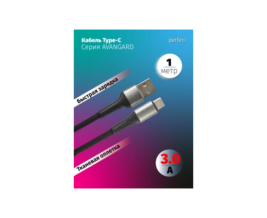 Кабель PERFEO USB A вилка - C вилка, 3A, черный, длина 1 м., AVANGARD (U4714)