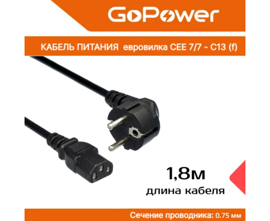 Кабель питания GoPower 00-00024054 евровилка CEE 7/7-C13 1.8м ПВХ 0.75мм черный 1/10/160