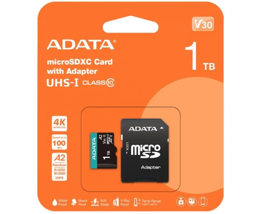 Карта памяти A-DATA AUSDX1TUI3V30SA2-RA1 1TB microSDXC Class 10 UHS-I U3 V30S A2 100/80 MB/s (SD адаптер)
