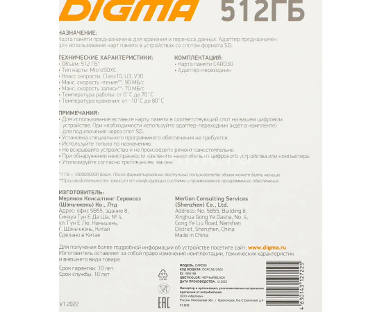 Карта памяти Digma Card30 (DGFCA512A03) microSDXC 512Gb Class10 + adapter