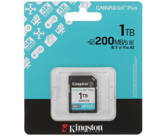 Карта памяти Kingston SDXC 1000 ГБ [SDG4/1TB] рассчитана на использование в широком температурном диапазоне – от -40 до 85 °C. Максимальная скорость чтения равна 200 МБ/с, а максимальная скорость записи – 160 МБ/с.