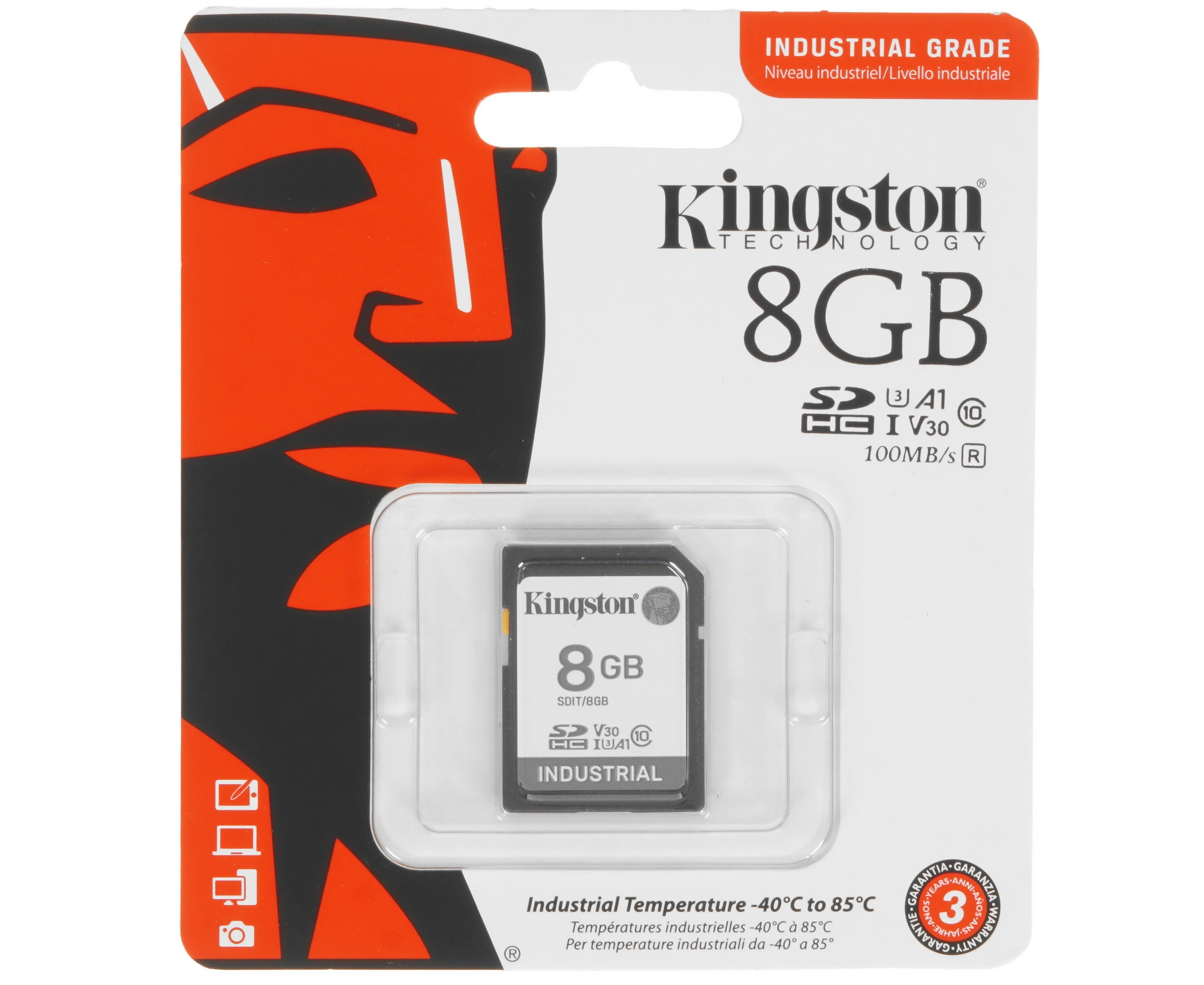 Карта памяти Kingston Industrial SDHC 8 ГБ [SDIT/8GB] рассчитана на эксплуатацию при температуре от -40 до 85 °C. Максимальная скорость чтения равна 100 МБ/с, а максимальная скорость записи – 80 МБ/с. Карта обладает функциями промышленного класса.