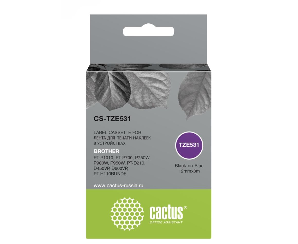 Картридж ленточный Cactus CS-TZE531: черный текст на синем фоне, ширина ленты 12 мм, длина 8 м. Ламинированная лента для печати наклеек подходит для маркировки любых предметов, от кабеля, трубопровода и оборудования, до папок и полок. Наклейки обладают хорошей устойчивостью к экстремальным температурам, трению, воздействию химикатов и солнечного света. Можно использовать на открытом воздухе.