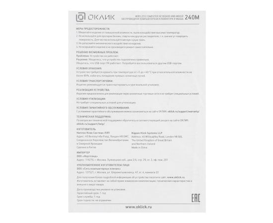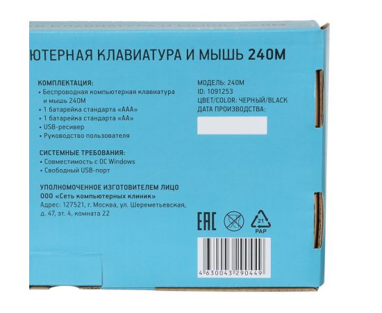 Клавиатура + мышь Oklick 240M клав:черный мышь:черный USB беспроводная slim Multimedia