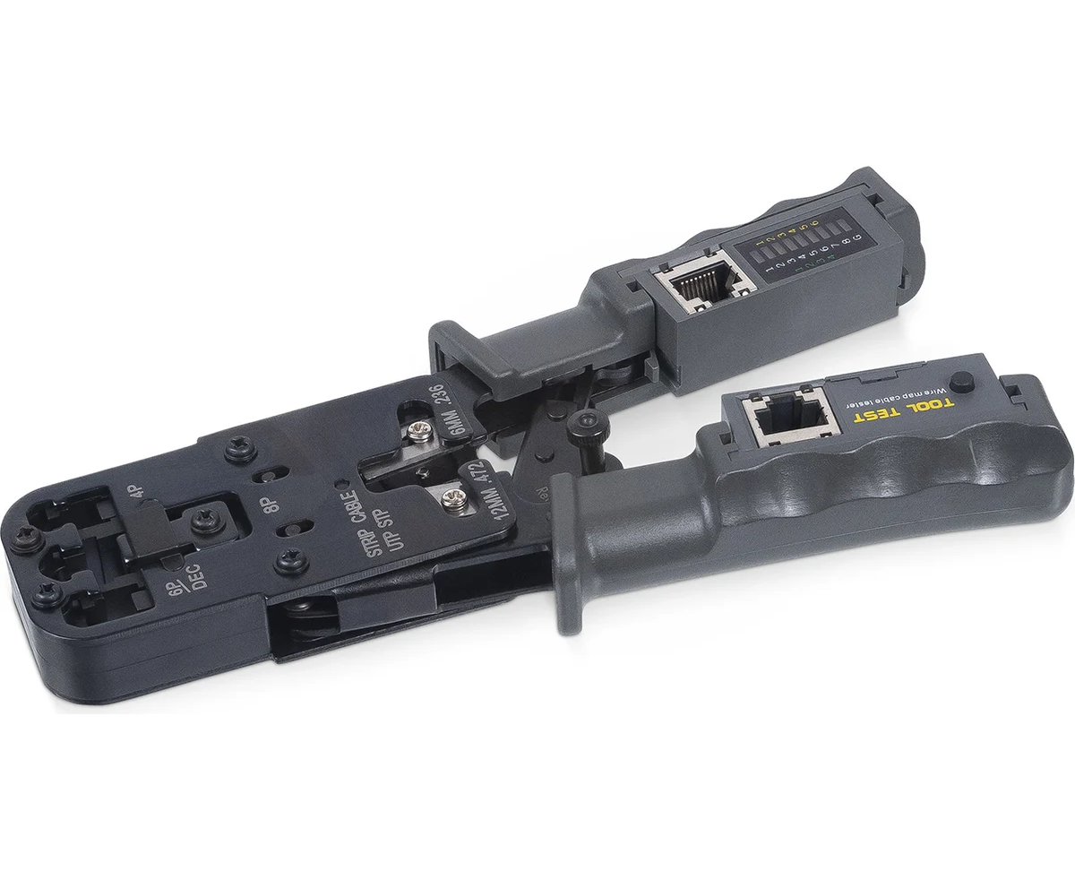 Устройство оснащено храповым механизмом и кабельным тестером. Кабельный тестер позволяет выявлять дефекты линий: перепутанные проводники, обрыв, замыкание.