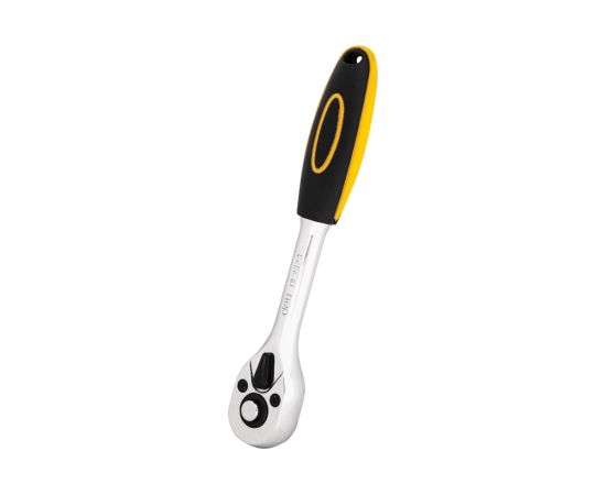 Ключ-трещотка упрощает затягивание крепежа в условиях ограниченного пространства. Ключ выполнен из качественной хромомолибденовой стали, что обеспечивает прочность и долговечность. Эргономичная двухкомпонентная ручка служит для удобного хвата и комфортной работы. Храповая головка с 45 зубьями с функцией реверса позволяет вращать ключ в обе стороны. Инструмент оснащён механизмом для быстрого сброса насадок.