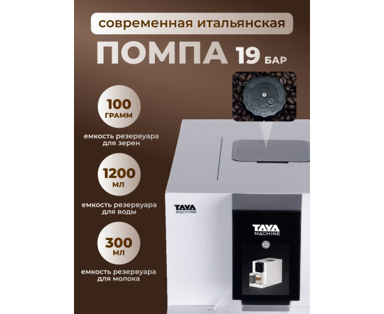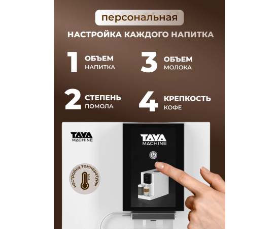 Автоматический капучинатор, позволит вам с легкостью приготовить идеальную плотную молочную пенку для капучино, латте и других напитков с молоком. Выберите объем напитка и сохраните свои предпочтения в памяти кофемашины, чтобы наслаждаться чашкой любого размера, в то время как TAYA machine R5 автоматически приготовит вашу идеальную порцию кофе.