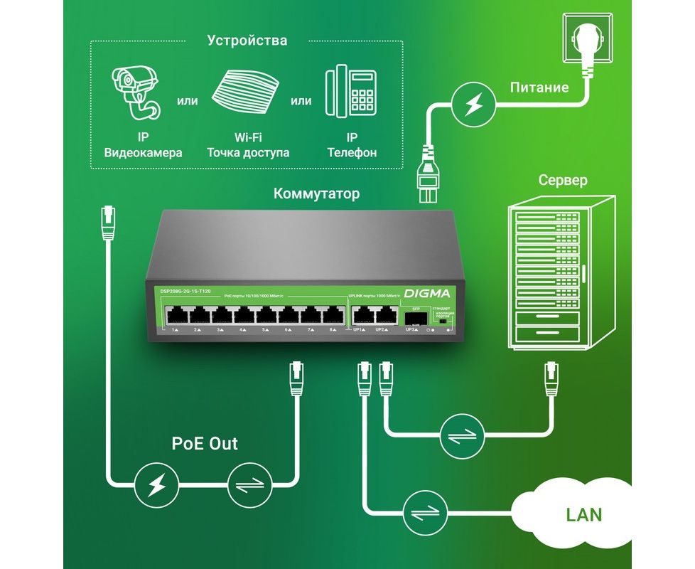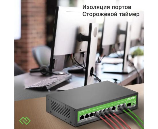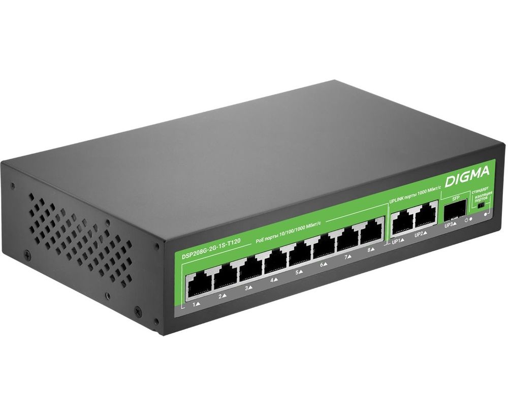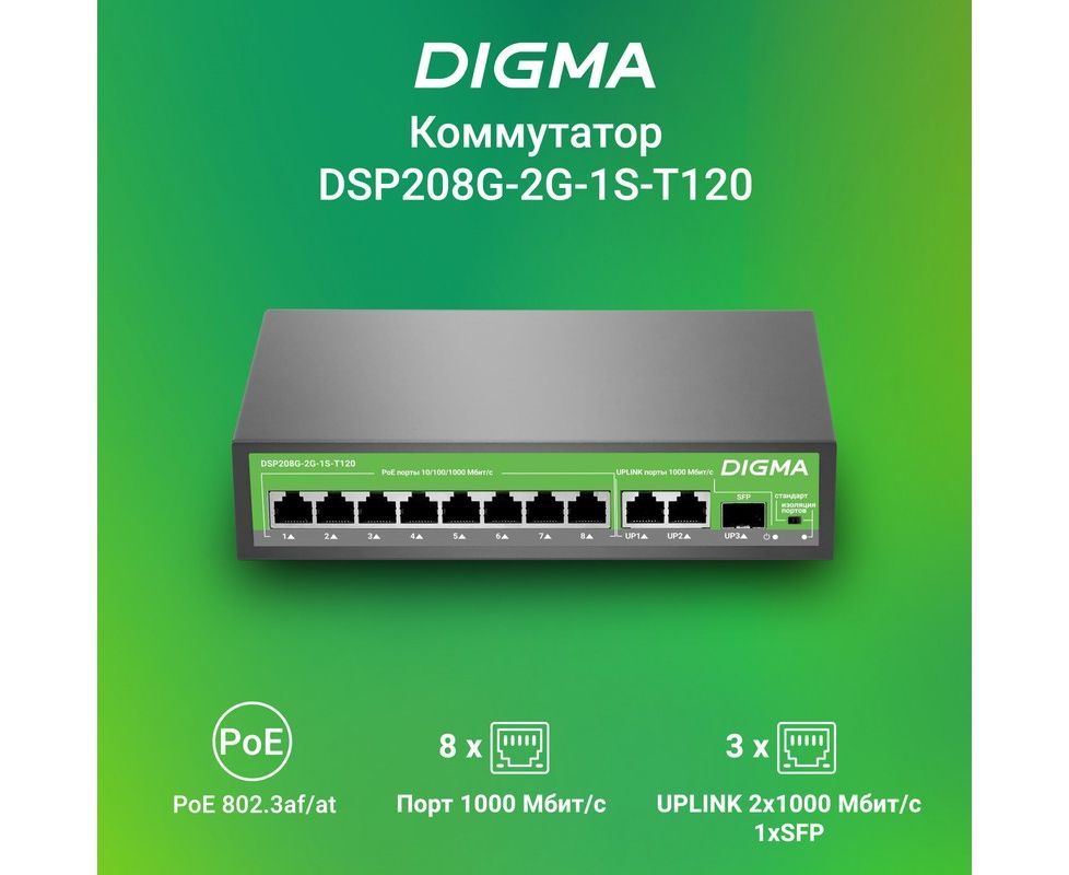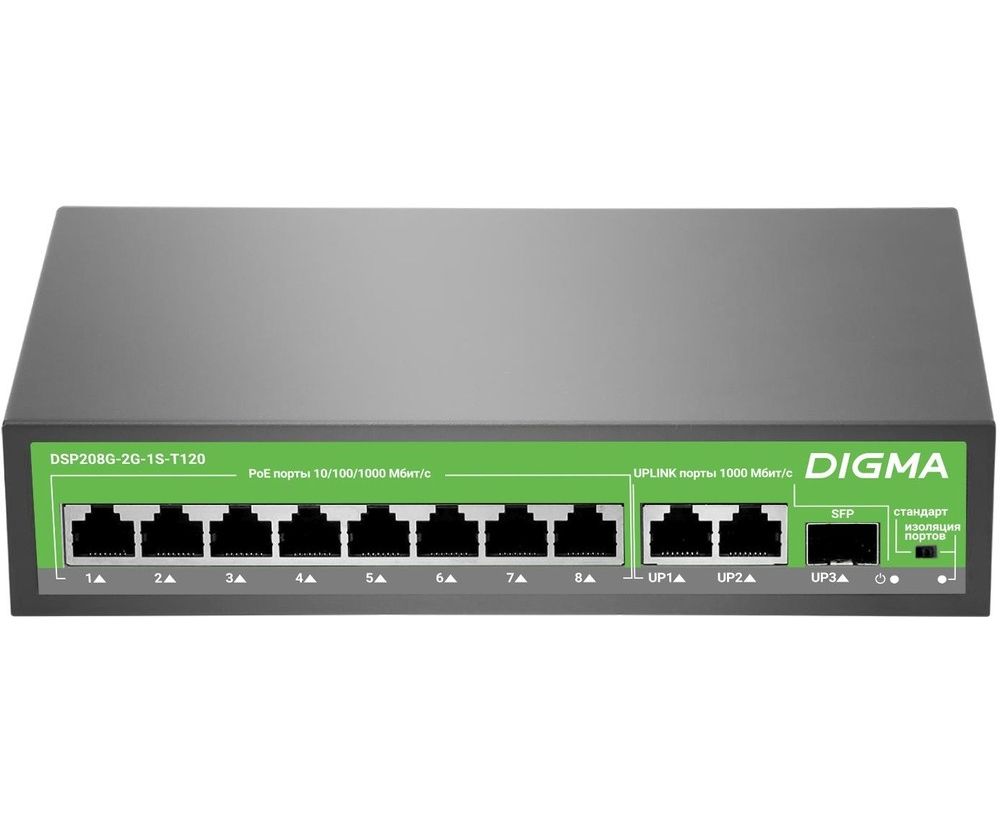 Коммутатор неуправляемый Digma DSP208G-2G-1S-T120 (L2) 10x1Гбит/с 1SFP 8PoE 8PoE+ 120W