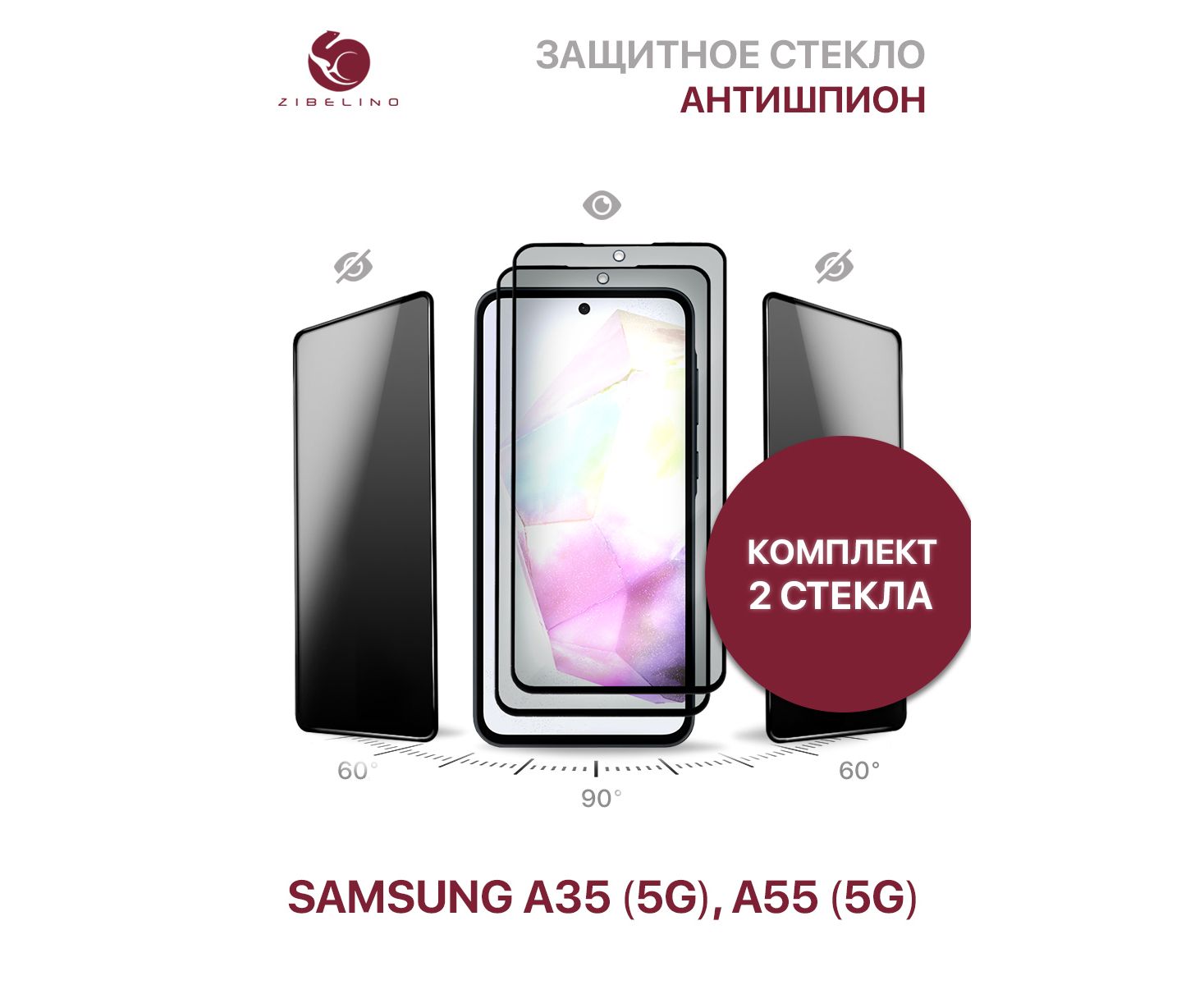 Комплект из 2 шт защитное стекло антишпион для Samsung A35 (5G) (A356), Samsung A55 (5G) (A556) полноэкранное, с рамкой (Самсунг Галакси А35 А55 А356 А556)
