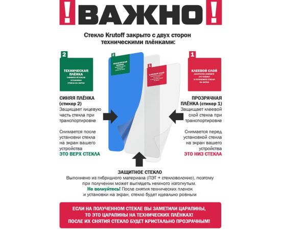 ГИБРИДНОЕ защитное стекло для экрана и камеры телефона сохраняет гибкость защитной пленки, и прочность стекла. Оно намного удобнее обычного закаленного стекла - как при транспортировке, так и при установке. Гибридное стекло тоньше, прочнее и надежно защищает смартфон от повреждений. Имеет отступы по 1 мм от края дисплея для удобства ношения защитного чехла. Оно имеет высокую степень устойчивости к царапинам, обеспечивает хорошую чувствительность к касанию и не влияет на сенсорный отклик по всей поверхности дисплея. Идеально прозрачное, не снижает четкость и яркость изображения, не меняет оригинальную цветопередачу. Изготовлено из гибкого композиционного материала (стекловолокно и ПЭТ). Верхний слой из стекловолокна по тактильным ощущениям близок к стеклу и не влияет на работу сенсора по всей поверхности экрана. Гибридное стекло гибкое, оно не растрескивается и не крошится, как обычное закаленное стекло. Защищает от пыли, грязи, брызг и царапин. Полная проклейка поверхности (Full Glue). Специальная смесь высококачественных клеев гарантирует установку без пузырьков воздуха и что стекло не отслоится с течением времени. Внимание! Гибридное стекло поставляется в двух защитных транспортировочных пленках (на тыльной и лицевой стороне). Данные пленки могут быть поцарапаны. После наклеивания стекла снимите защитную синюю пленку "2" с лицевой стороны!