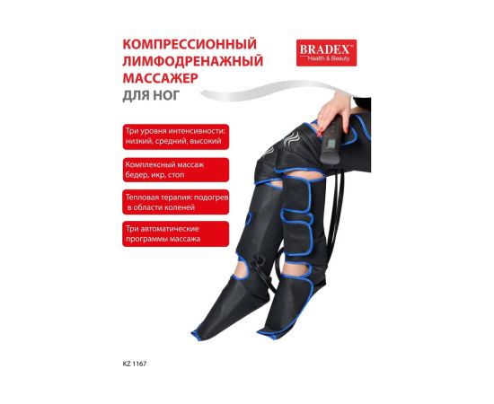 Компрессионный лимфодренажный массажер для ног BRADEX прогрев коленей, длинные манжеты, черный KZ 1167 – профессиональное устройство для проведения прессотерапии и лимфодренажа ног с дополнительной функцией подогрева в области коленей в домашних условиях.